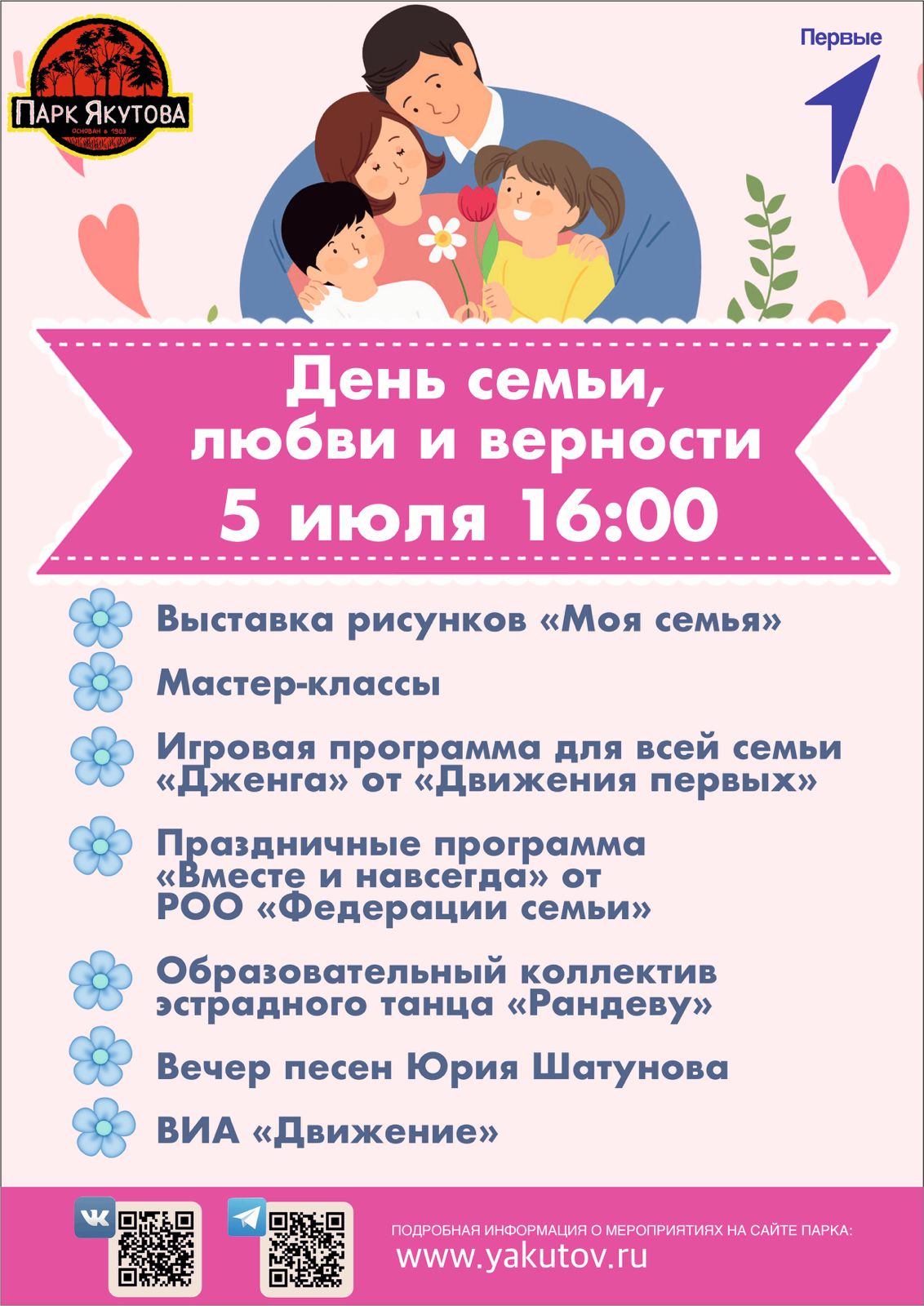 5 июля в парке Якутова праздничная программа приуроченная ко Дню семьи, любви и верности 🧑🧑🧒🧒